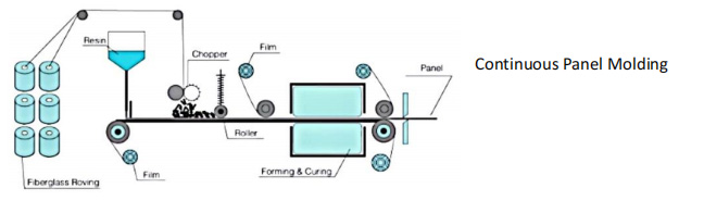 Resin mix is applied to a base film moving at constant speed and flattened to ensure uniform thickness, chopped fiber in specified length is distributed evenly onto the resin matrix (or fiberglass mat impregnated with resin mix), covered with a top film and moved into the curing oven.