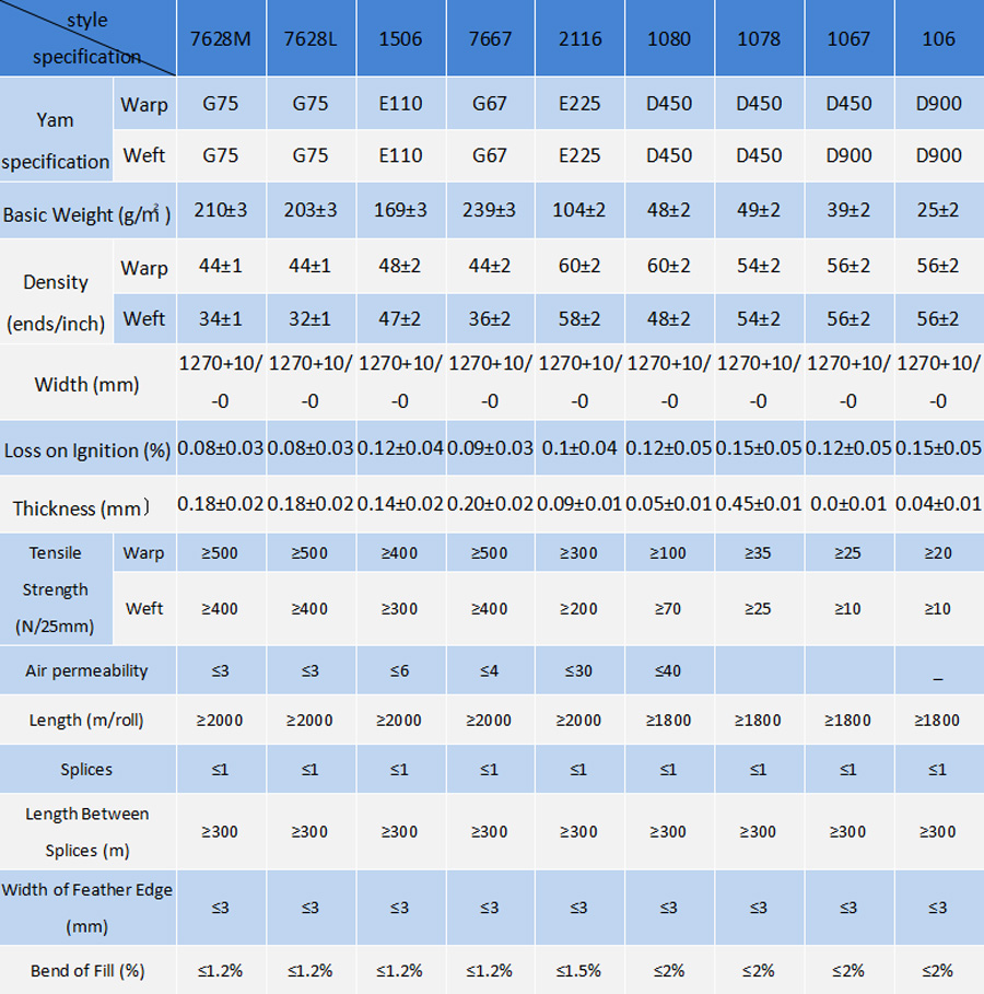 Electronic fiberglass fabrics is plain weaved on air-jet looms by intersecting warp and weft, the fabric, surface is treated after 1st and 2nd de-sizing for designed electrical insulation properties, physical & chemical properties and processing performances of Copper-clad Laminates.