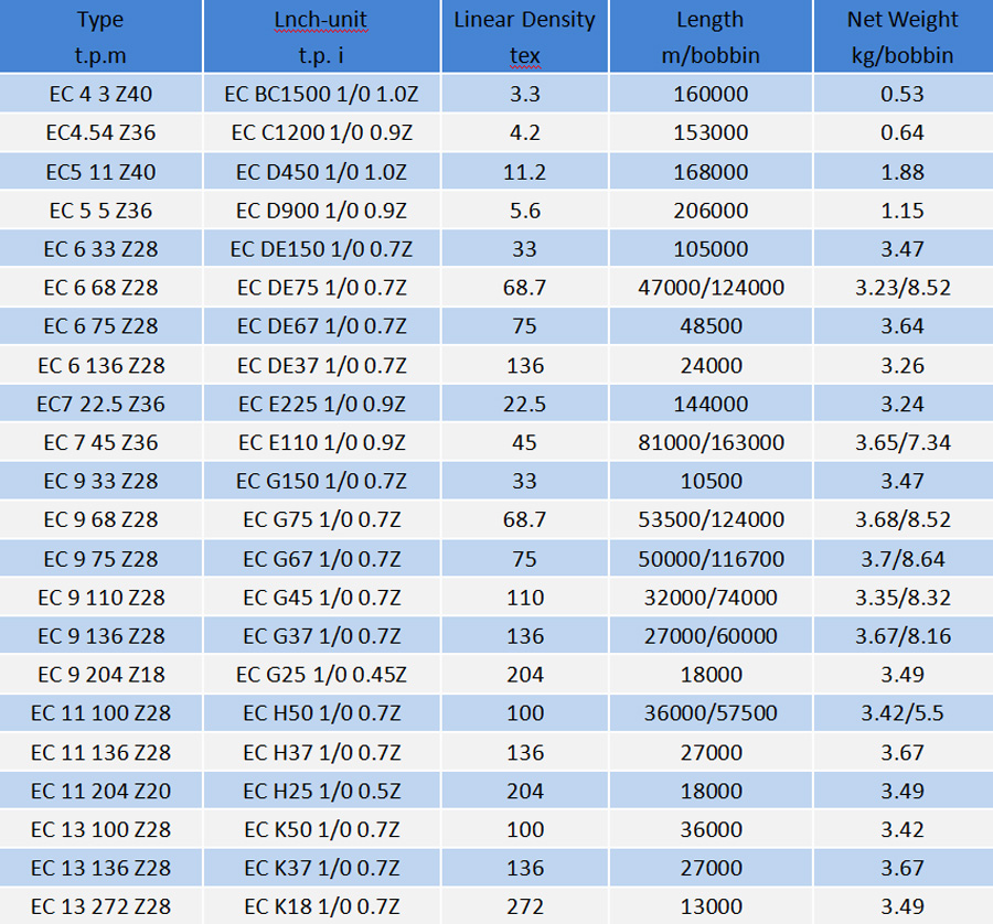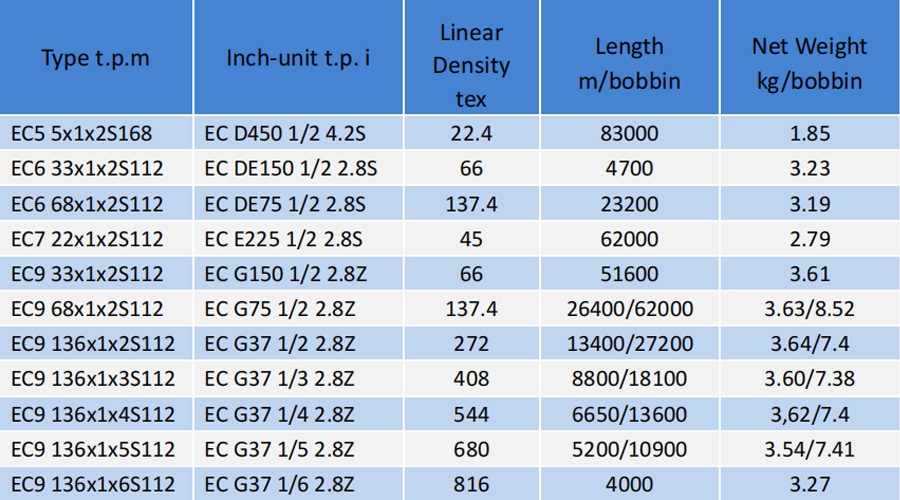 Number of single yams plied: 2~6, Twists of plied yarn: 90 ~150/m