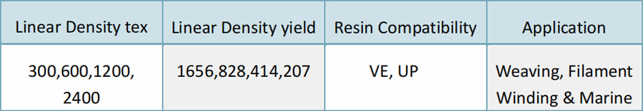 E-glass direct roving for weaving has excellent process-ability, good compatibility with UP, VE & EP resins and is widely used to produce multi-axial fabrics, geo-grids and woven roving, etc.