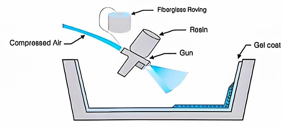 Fiberglass assembled roving is chopped & sprayed along with resin mix onto the open mould evenly, compressed for complete impregnation & air bubble removal and cured.