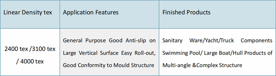 Spray up roving is coated with silane-based sizing, compatible with UP, VE resins and widely used to produce sanitary devices and marine vessels
