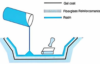 Resin mix and fiberglass reinforcements (roving, woven roving or mat) are put into mold layer by layer, completely impregnated with air bubble removed, laminated to designed thickness and cured