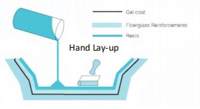 Resin mix and fiberglass reinforcements are laid into mold layer by layer, completely impregnated with air bubble removed, laminated to designed thickness and cured.