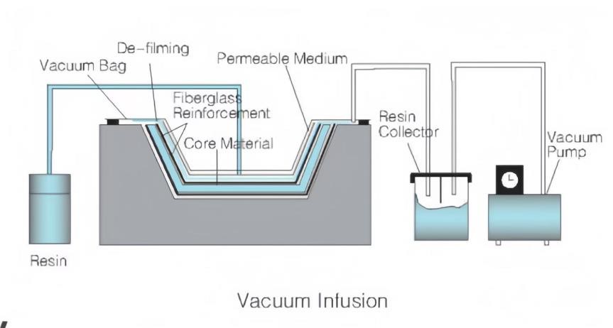 Air is extracted completely from inside the vacuum bag with fiberglass reinforcements, and resin is forced by pressure into the reinforcements, uniformly impregnated and cured to form the laminates after vacuum bag removal.