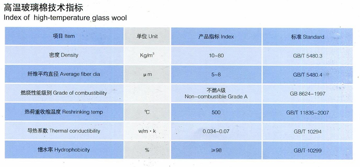 High-temperature glass wool includes two major series, that is high-temperature glass wool felt and high-temperature glass wool board. This glass wool is a kind of heat preservation glass wool containing slightly lower glue than common glass wool but showing greatly advantageous by its light weight and stable heat preservation effect. These products, with good heat preservation and noise reduction effect, are generally used for heat preservation of hot air duct, flue in power plant, steam pipeline and pipes with a packed diameter of over 300mm, and are widely used for high temperature containers such as boilers, reaction kettles and tanks in power plant, chemical engineering, pharmacy and some other industries.