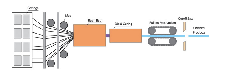 The rovings, mats or other fabrics are pulled through a resin impregnation bath and then into a heated die using a continuous pulling device. The final products is formed under high temperature and high pressure conditions.